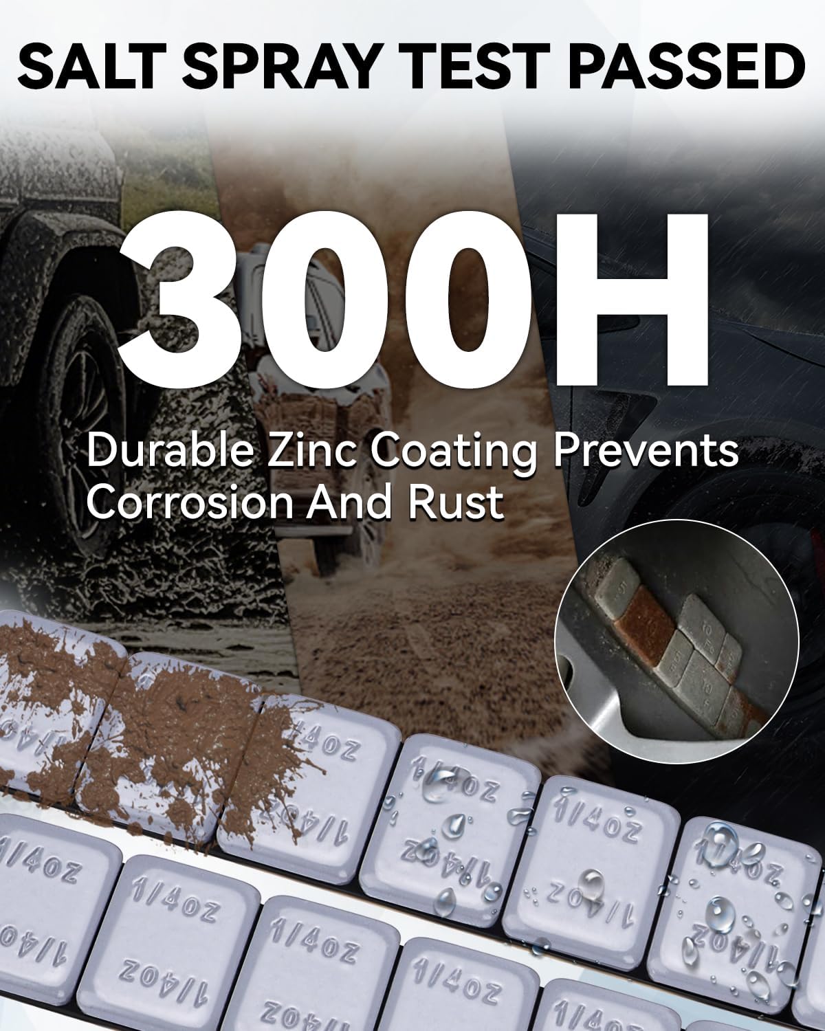 - Anti-Corrosion: The surface of the wheel weight is treated with an electro galvanizing process. 300 hours salt spray test passed, they can be used in humid environments with temperatures ranging from -20Β°C to 80Β°C. Even after prolonged use, they won't rust or be damaged