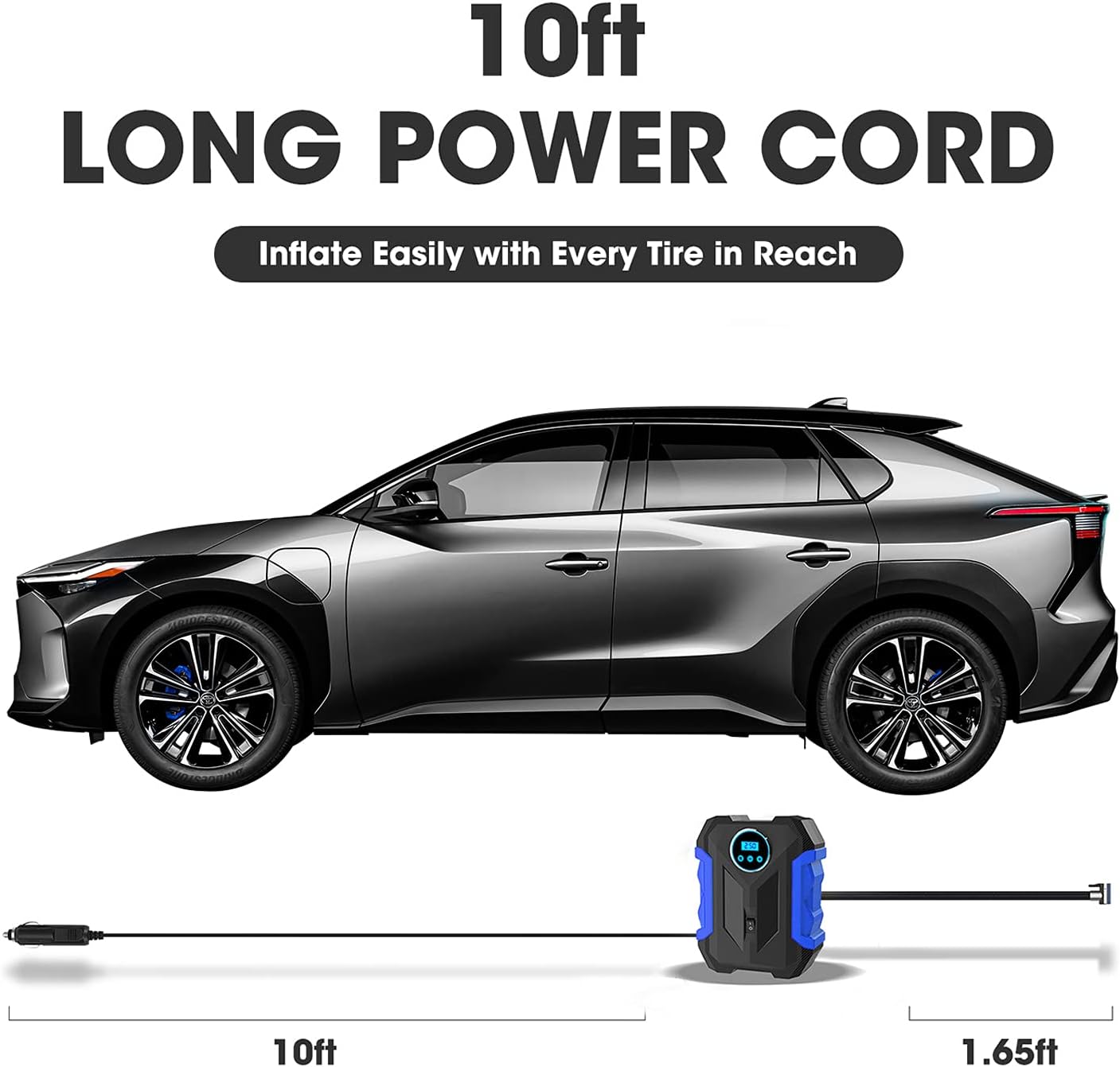 - 【MULTI-PURPOSE】:Carsun air compressor pump has a 10ft power cord and inflatable adaptors( 4 additional nozzles) allowing to reach all tires of your car, bike, motor, ATV, compact or midsize Sedan, SUV, air mattress, inflatable boats, balls and other inflatables (NOTE: NOT SUITABLE FOR TRUCKS OR MOTOR LORRIES).
