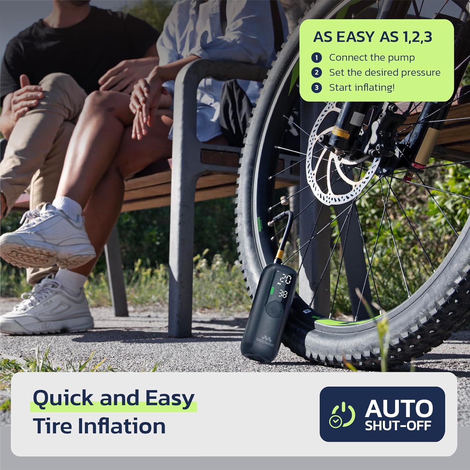 - COMPACT & PORTABLE: Designed to fit in your glove box or backpack, this lightweight and cordless inflator is ideal for on-the-go inflation without the need for a 12V DC outlet. Ergonomic, store directly the flexible hose inside the portable electric air pump compartment after usage.