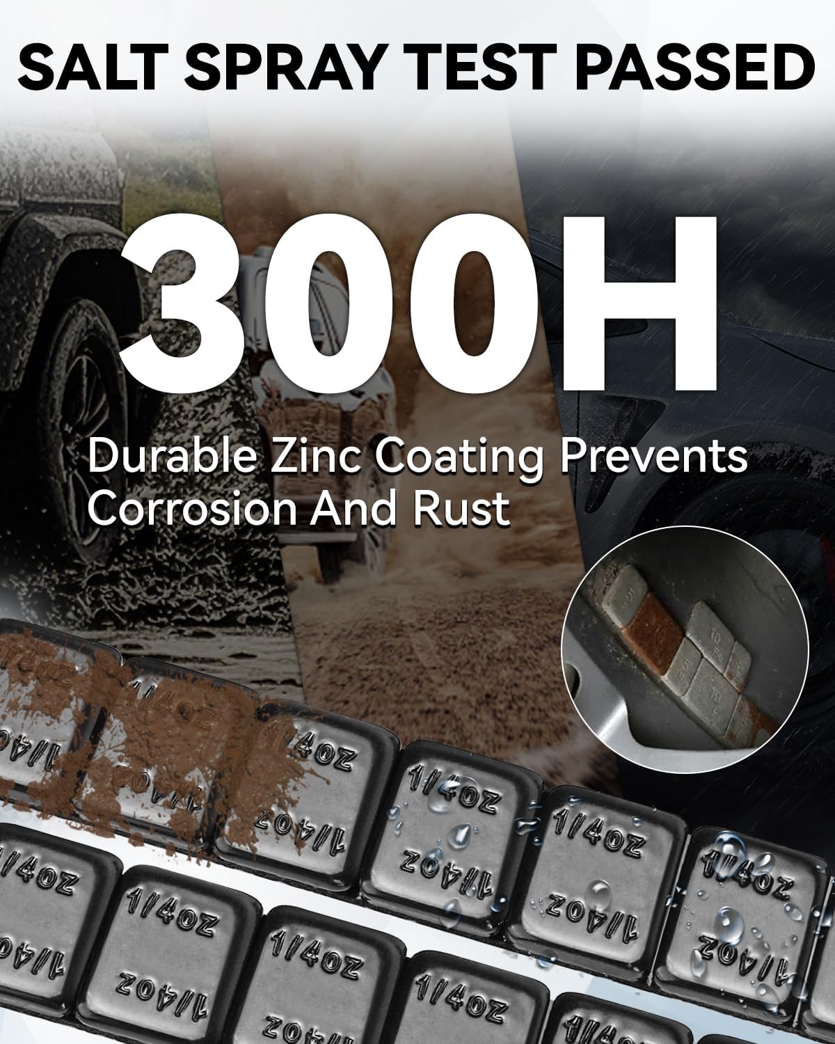 - Anti-Corrosion: The surface of the wheel weight is treated with an electro galvanizing process. 300 hours salt spray test passed, they can be used in humid environments with temperatures ranging from -20Β°C to 80Β°C. Even after prolonged use, they won't rust or be damaged