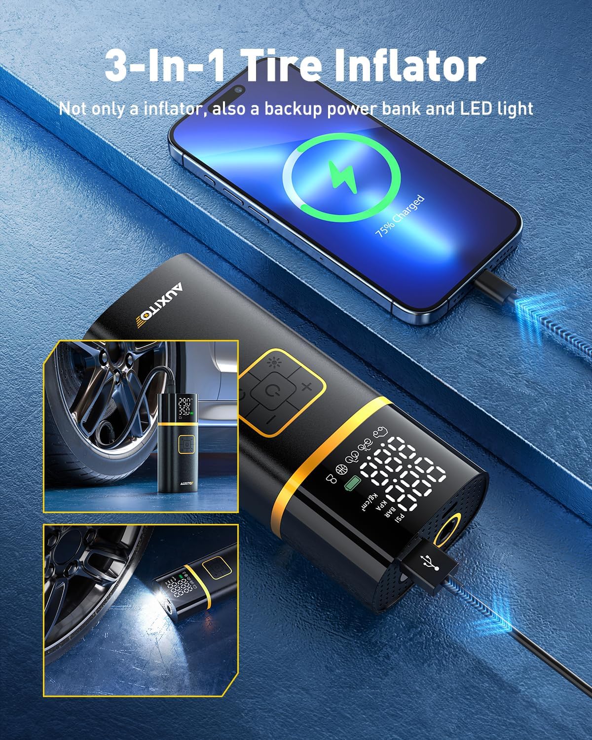 - Compact & Portable: Never worry about flat tires again with AUXITO electric air pump. This air pump for car tires is designed to be portable and lightweight, making it easy to store in your car or garage. Come with a mini storage bag to store all the accessories. Whether you're on the road or at home, this car tire inflator will quickly and efficiently inflate your tires to the correct pressure.