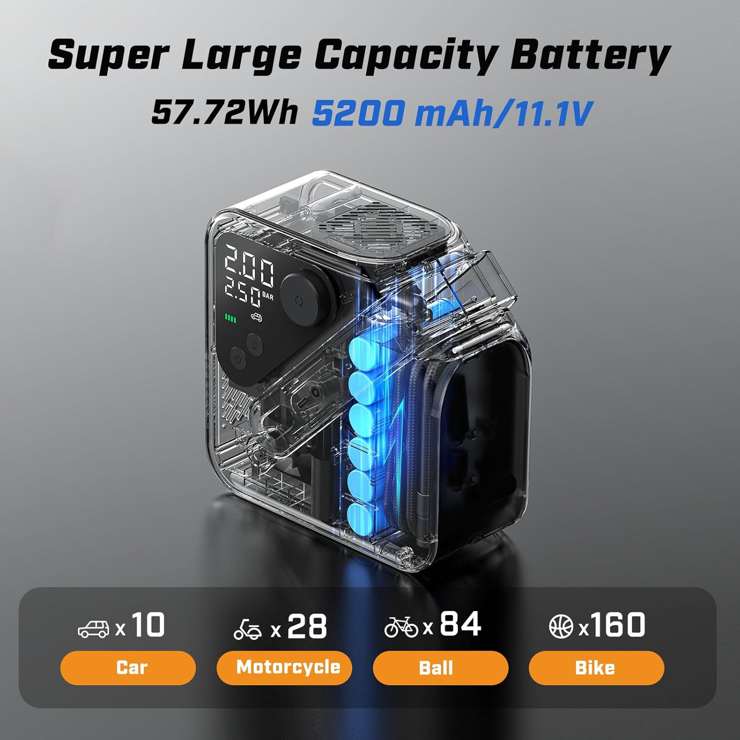 - 【15600 mAh LITHIUM BATTERY】 AL7 tire inflator can inflate 9 F-150 tires (315 70/R17 ) from 28 to 36 PSI on full charge. Along with USB-C 30W dual-direction fast charging port, fully charged in just 150 Min.