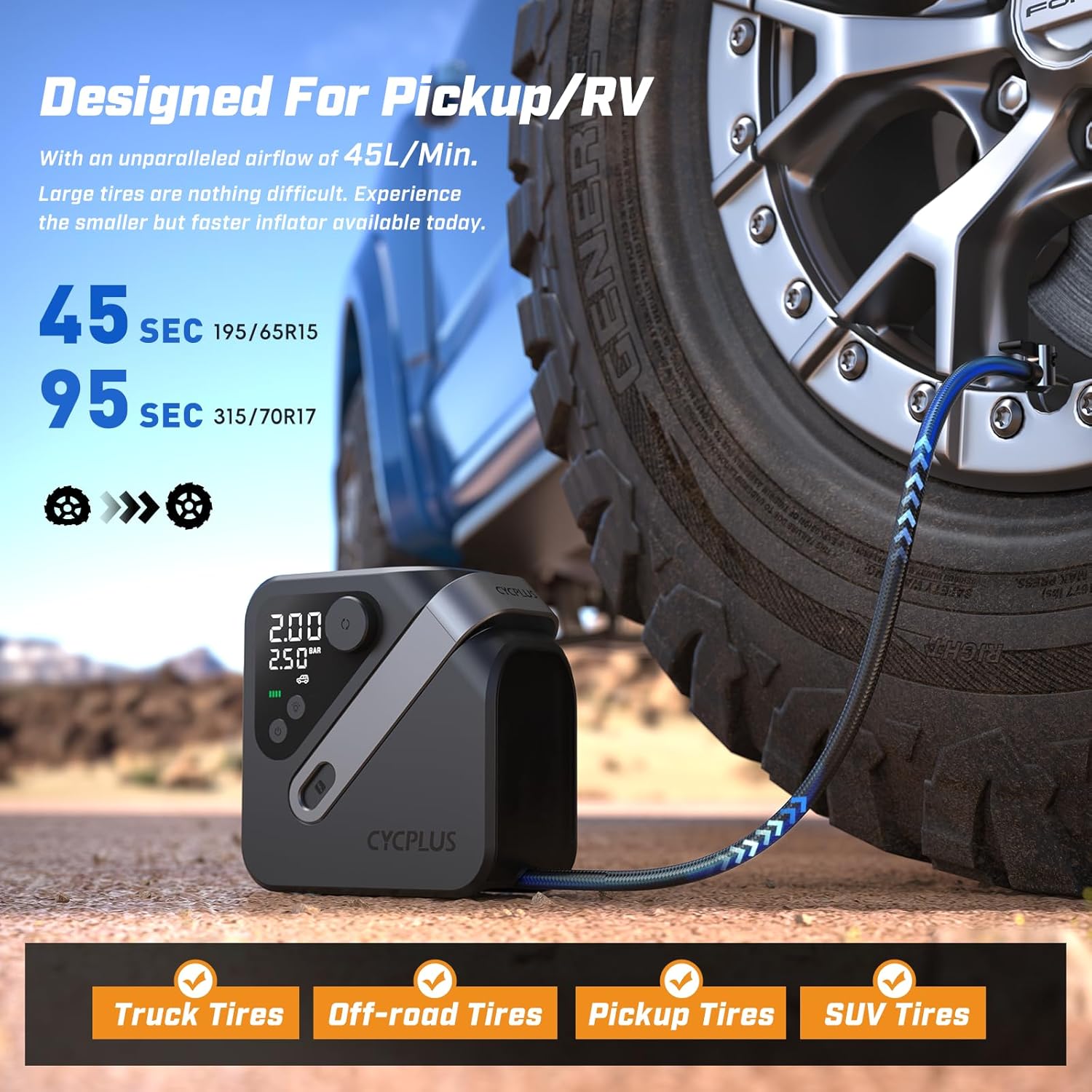 - 【4X Faster Inflation】: 45L/min airflow!!AL7 air pump refill a 315/70 R17 Pickup tire in 2 Min (30-36 PSI), or fill a LT275/70 R18 Truck tire in 4 Min(72-80PSI), 100 PSI Max