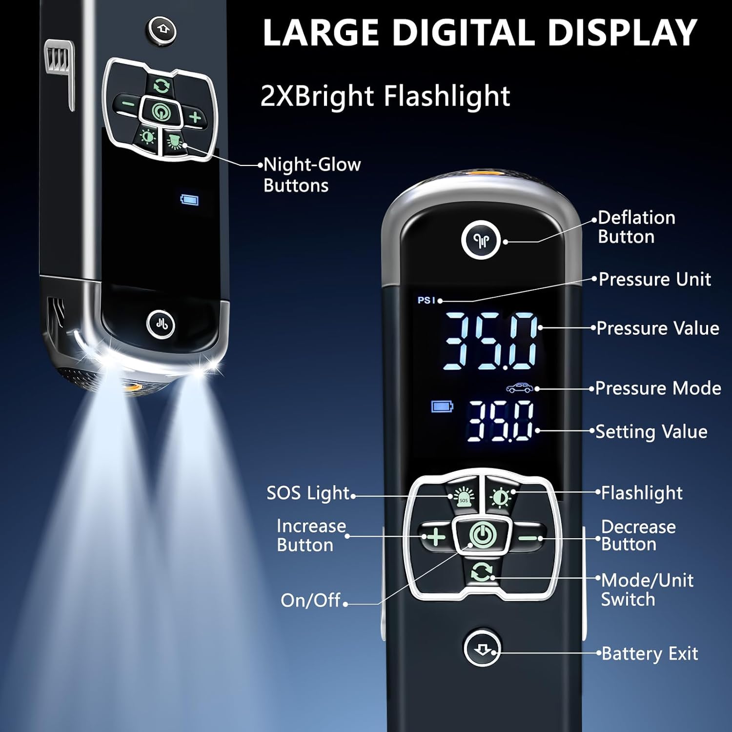- FAST & ACCURATE INFLATOR/DEFLATOR-The portable tire inflator with large dual-value screen boasts a 2X faster metal motor, delivering 30L/Min airflow for inflating a 215/55 R17 small car tire (28-35PSI) in just 56 seconds. The integrated air pressure gauge ensures inflation accuracy to within 1%,while the deflation function adapts to various conditions like muddy terrain, deserts, snowy areas, off-roading, and heavy loads.(Not for trucks and paddleboards)