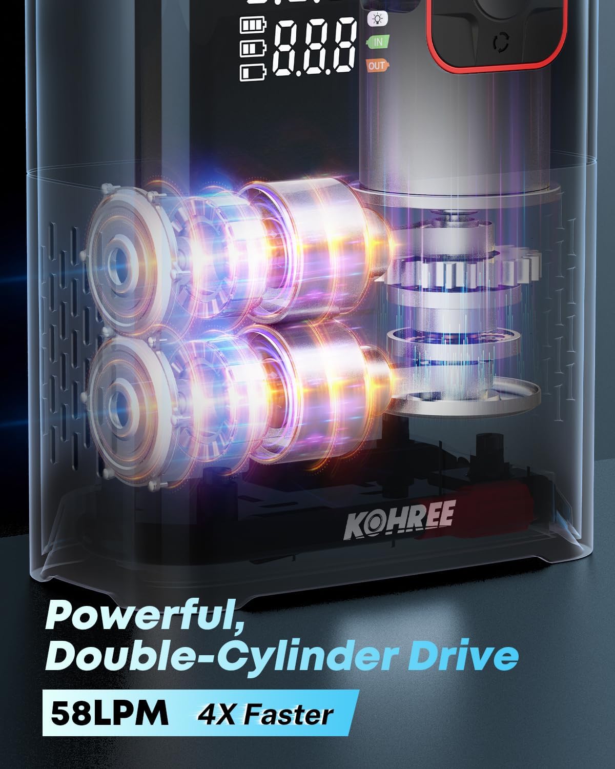 - Fast Inflation & Auto Shut-Off: Kohree portable tire inflator features a dual-cylinder motor with an airflow rate of 58 LPM, which is 4X faster than the airflow rate of a single-cylinder motor, typically measured at 35-38 LPM. The air pump automatically shuts off once your tire pressure reaches the preset pressure value, ensuring that the tire pressure is balanced inside and outside