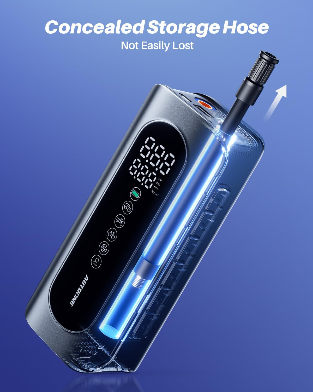 - PORTABLE TIRE INFLATOR: Concealed storage tube, ultimate portable design. Compact and lightweight, it easily fits into a backpack, car trunk, or even a motorcycle's storage compartment. Whether you're on a road trip, cycling adventure or daily commute, you can carry it with you without any burden and inflate your tires anytime, anywhere.