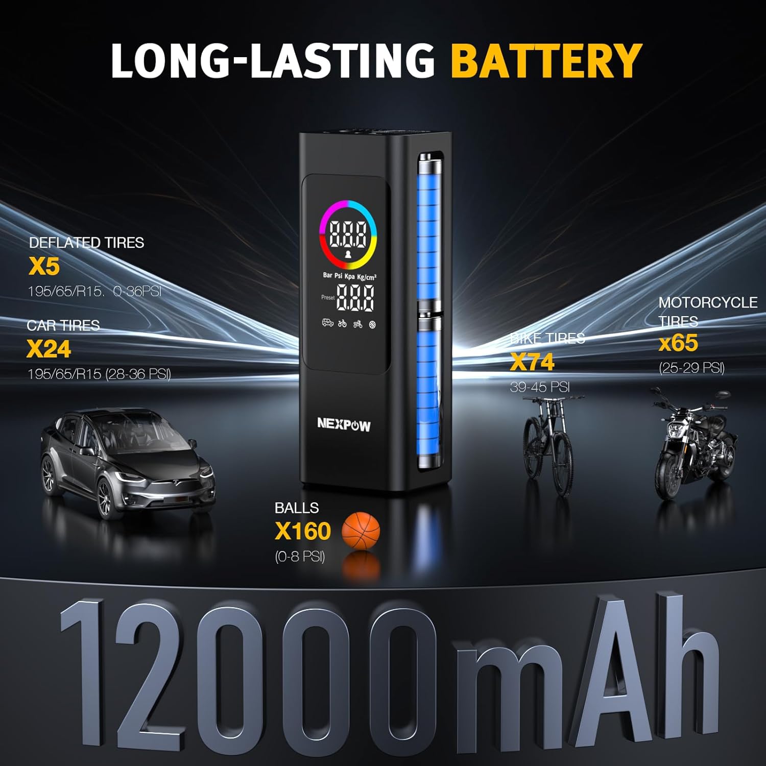 NEXPOW 150 PSI Tire Inflator Portable Air Compressor, 12000mAh Battery Auto Shut-Off Air Pump for Car Tires, Fast Inflation Dual LCD Display Tire Pump, Pocket Air Pump for Bike, Motorcycle, Ball, Car
