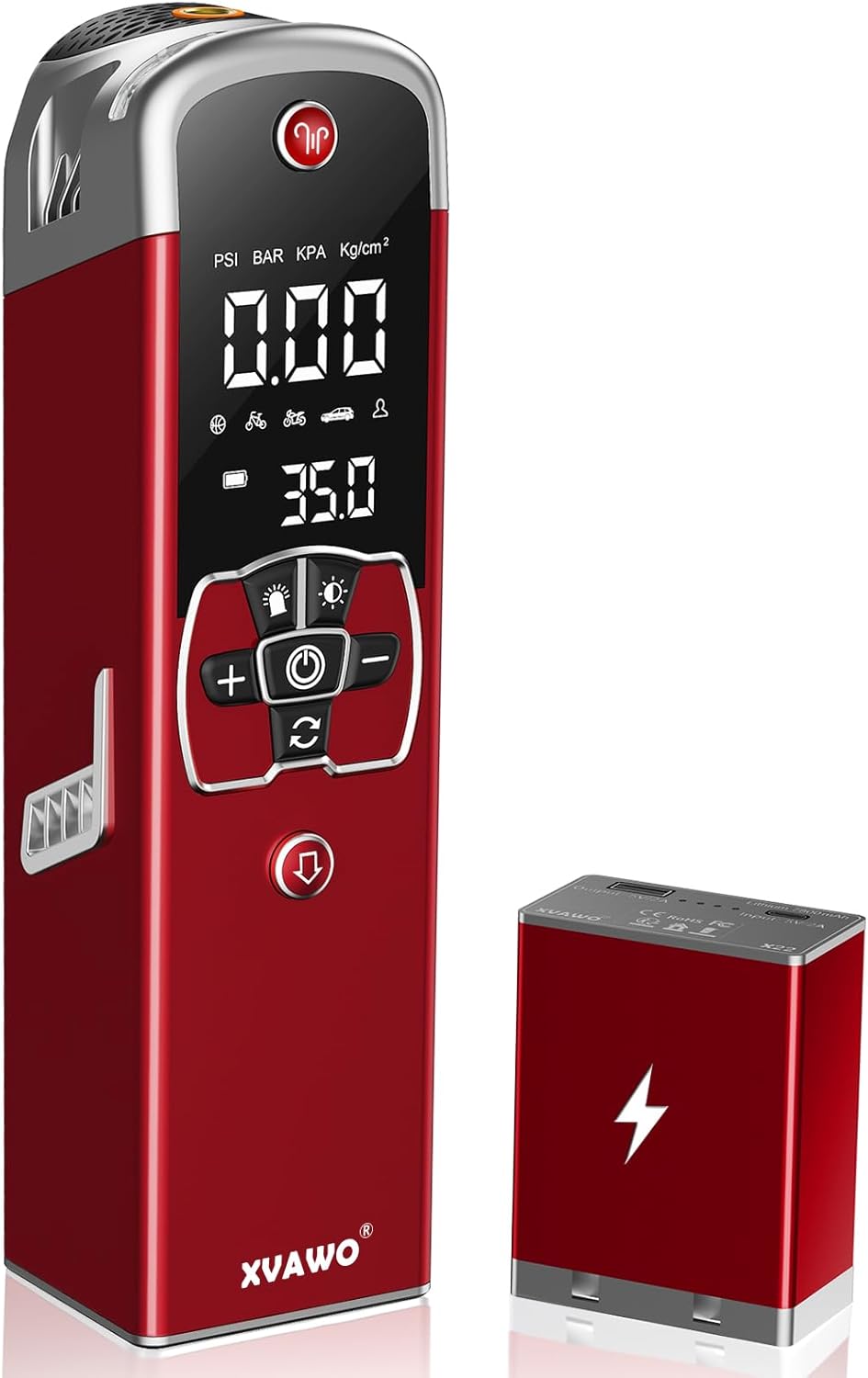 - DETACHABLE & ENDURING POWER -The compact bike pump comes with a 7800mAh removable battery,It can be easily separated from the portable air pump and used as a backup power supply for your smartphones.Recharging it at home or in your car using a cigarette lighter or USB cable,making it an ideal companion for outdoor adventures or emergency power needs.