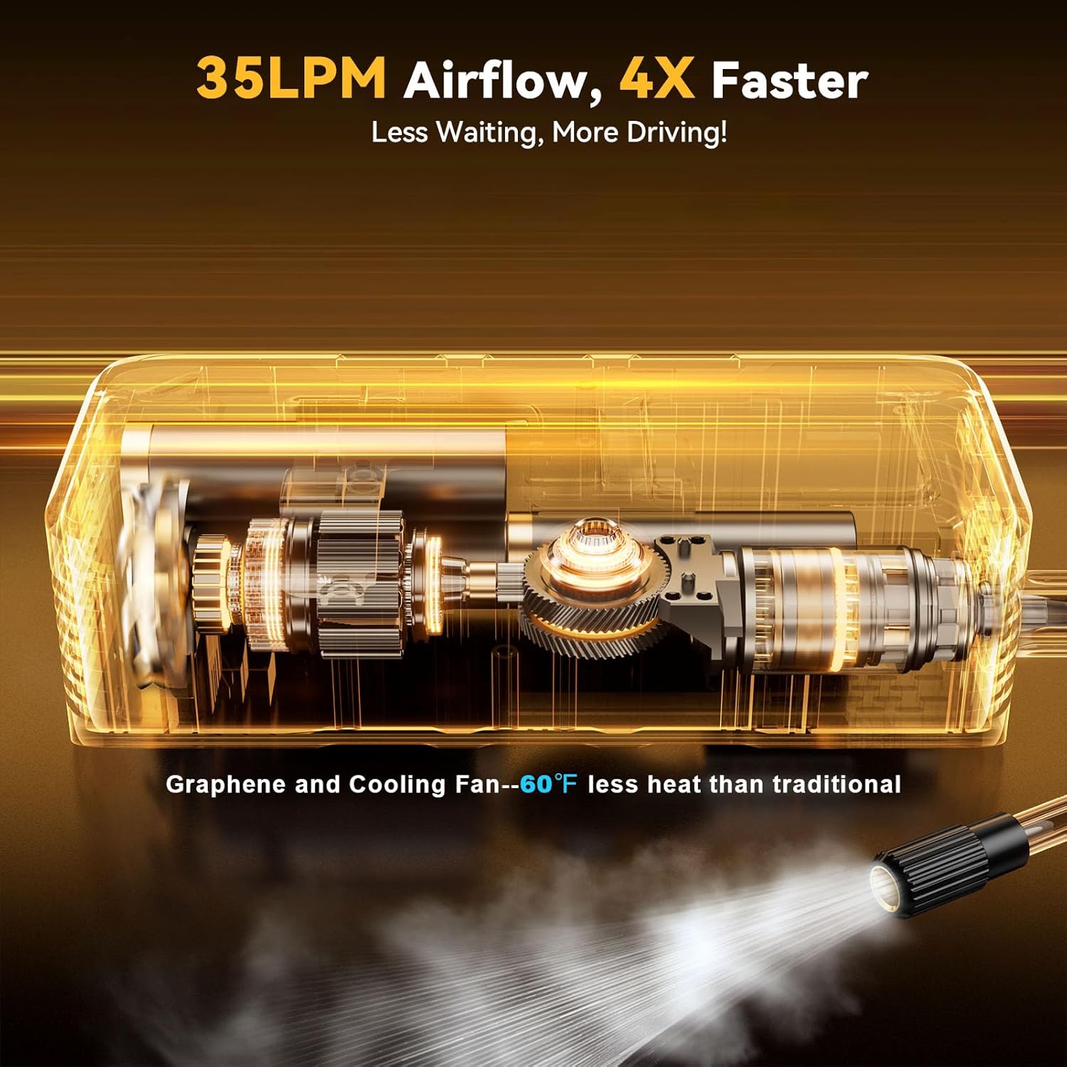- [Faster Inflation & Quick Cooling] Equipped with an advanced pump core and a powerful 22,000RPM motor, this cordless tire inflator delivers a 35L/min airflow—4X faster than traditional inflators. The air hose features a unique knob design, crafted from automotive-grade materials. Paired with graphene and a built-in cooling fan, its dual heat dissipation technology keeps the surface temperature up to 60℉ cooler than other inflators, ensuring uninterrupted performance even during extended use