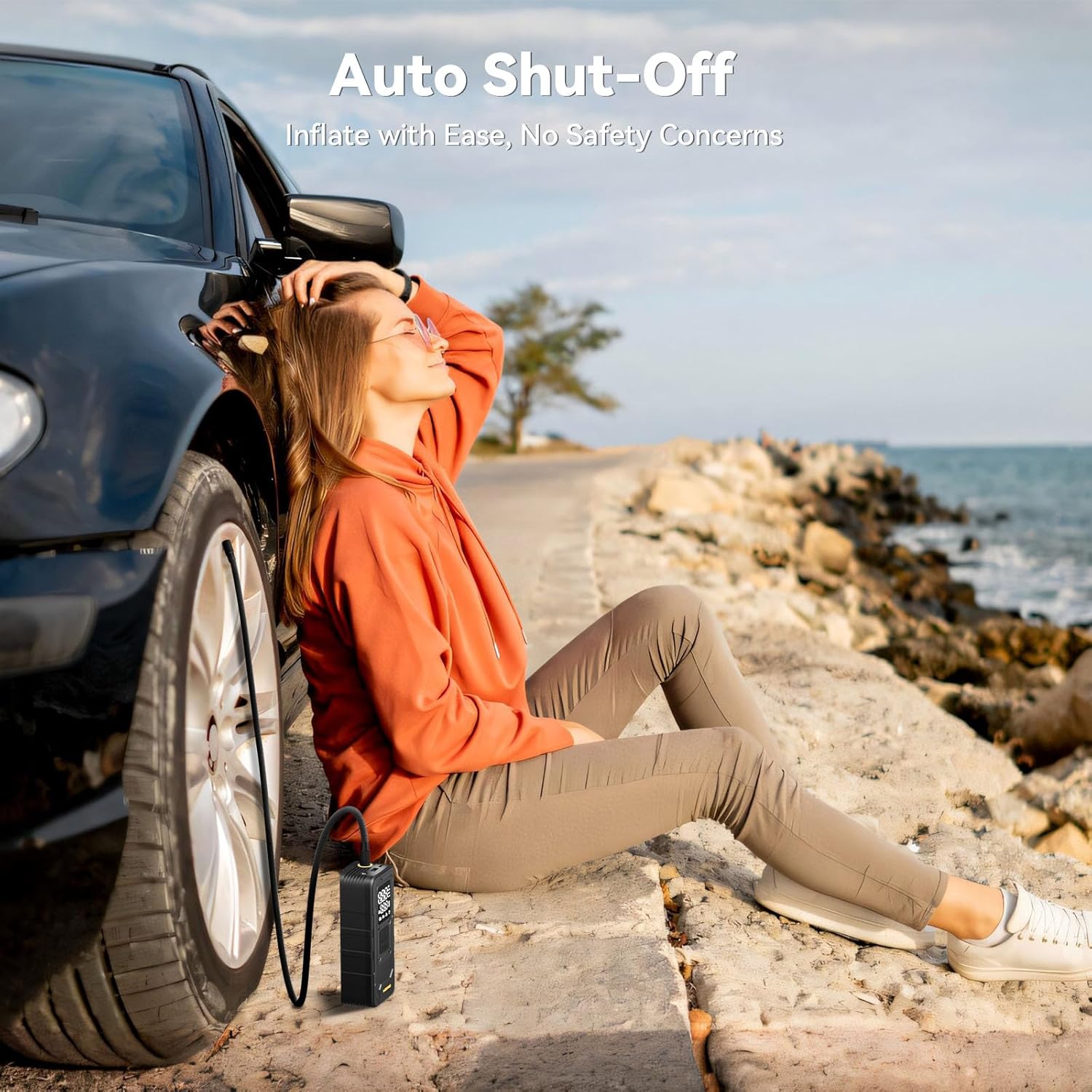 - [Safe & Reliable] One-click design makes MODARI easy to use. Set down the desired value on this portable air compressor for car tires, this cordless tire inflator will auto shut off when it reaches to avoid the hazards caused by over-inflation. This air compressor for car, made from UL94-V0 fireproof material, provides all-around safety protection from overcharge, short-circuits, overheating, etc. Even if you're a novice about air pump for car tires, you can get started quickly and use it safely