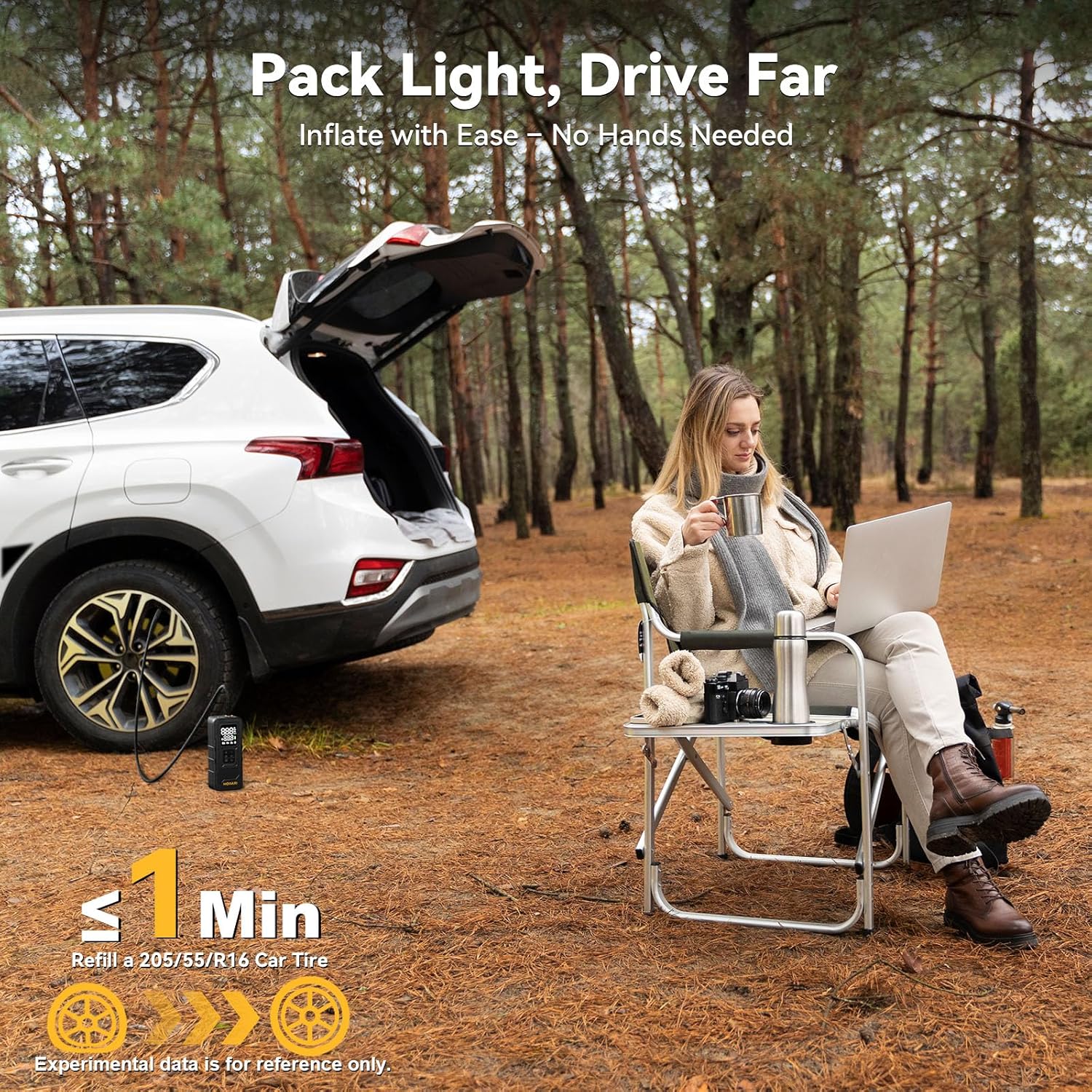 - [Travel Companion] MODARI tire inflator portable air compressor is your reliable travel partner. This air compressor for car can inflate a 205mm tire from 30PSI to 36PSI in 1 minute. Perfect for long road trips, this portable tire inflator for car lets you top up tire pressure quickly—about the time to enjoy a cup of coffee! Skip the trip to the gas station to pump deflated tires or replace a spare tire on the way. This air pump for car tires can let you enjoy the absolute pleasure of driving