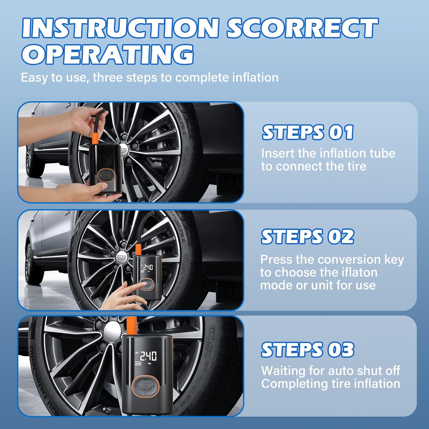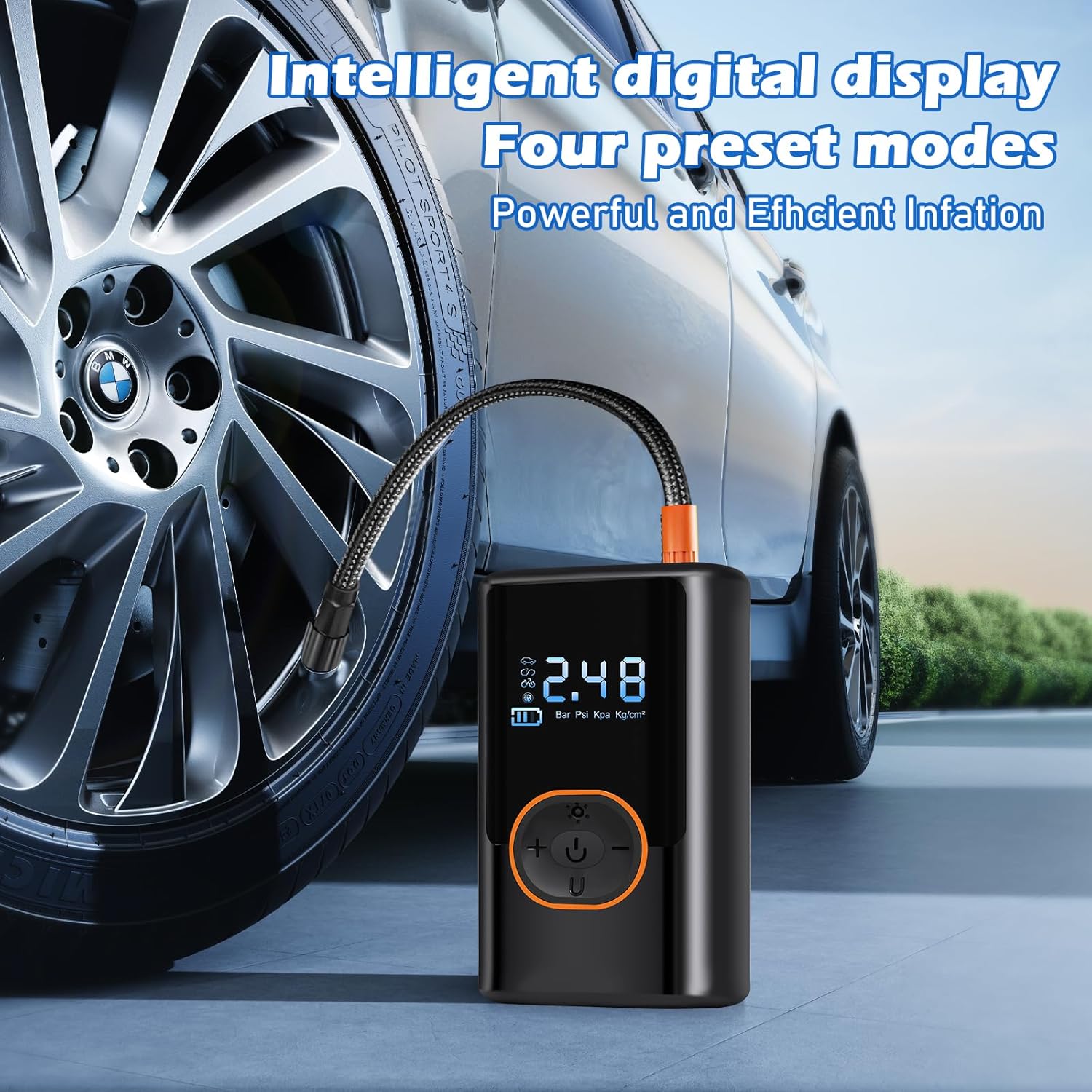 - Precision Monitoring & Auto-Shutoff The air pump for car tires features a built-in pressure gauge and LCD screen for real-time PSI tracking. Its preset tire pressure function prevents over-inflation by automatically shutting off at your target pressure, ensuring safety and optimal tire performance.