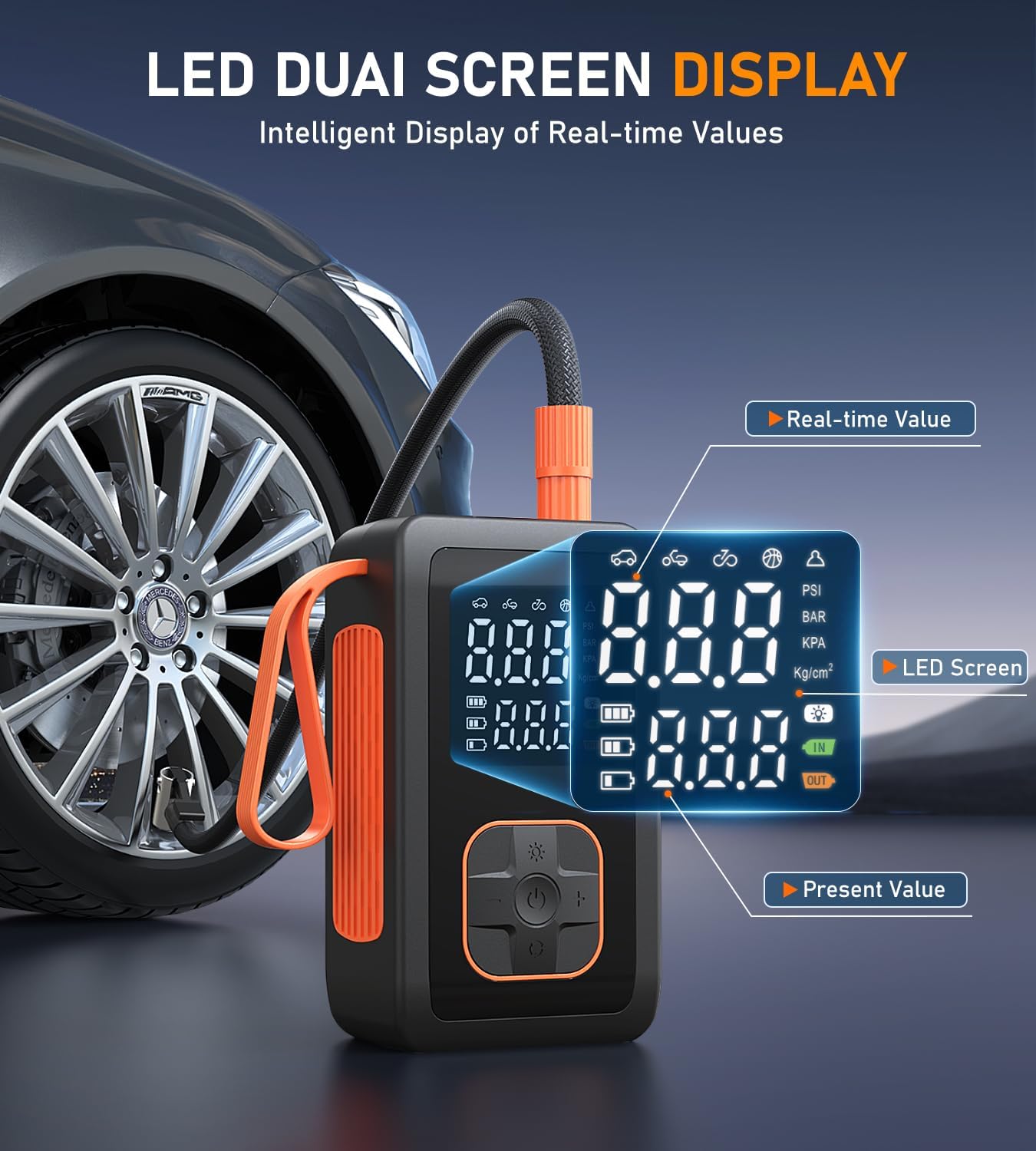 - 【4+N Intelligent Modes】With a dual display screen, you can easily read tire preset value and real-time pressure value. 4 preset inflation modes: bicycle, motorcycle, car, and ball. The manual mode can also set the pressure value (3-180psi) according to the inflation object. Our portable air compressor meets all your inflation needs