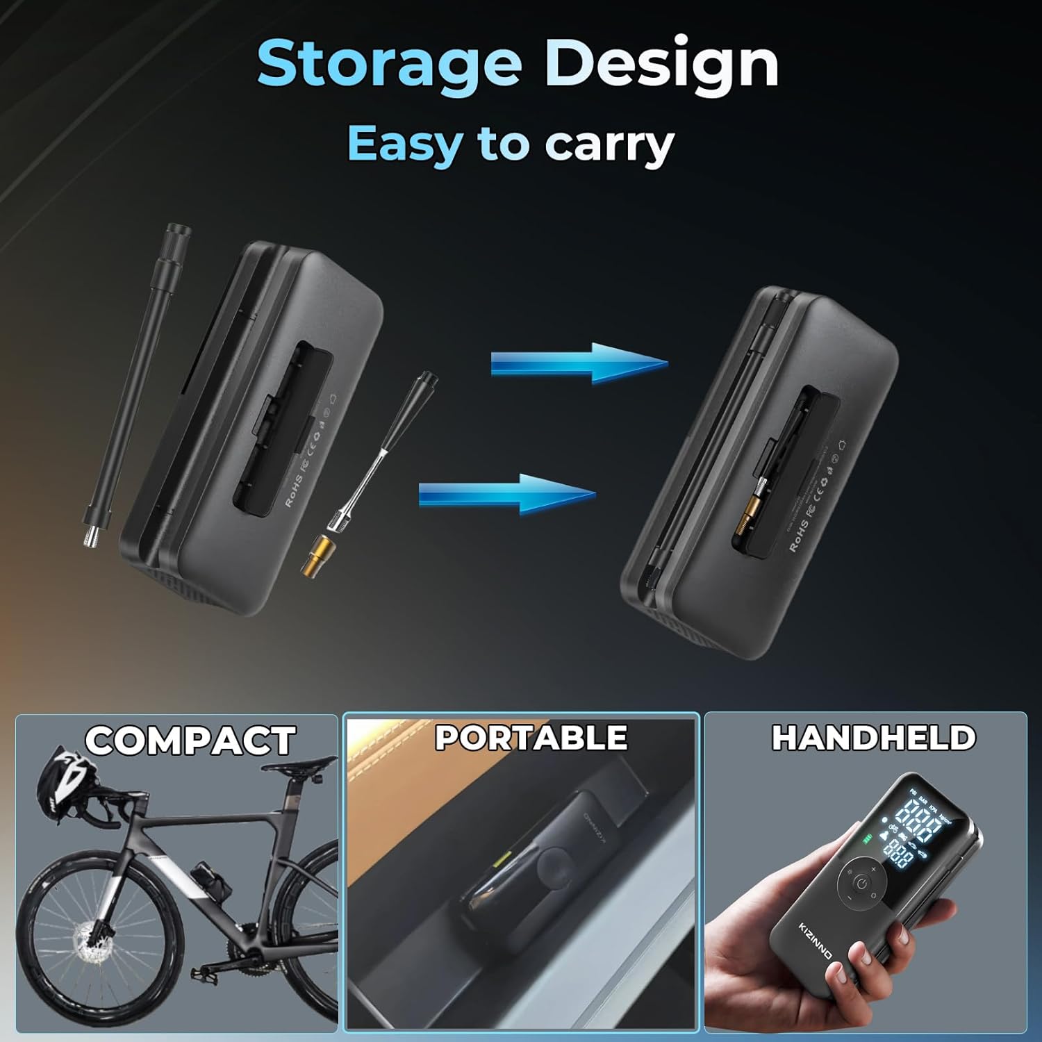 - Powerful, Faster, and Long-Lasting Tire Inflator and PowerBank - KIZINNO portable tire inflator offers powerful performance, inflating car tires, dirt bikes, motorcycles, bicycles, and sports balls quickly. With a 15,000mAh battery, it can handle up to 12 car tires or a month of bike commutes on a single charge and fill 2 flat car tires with ease. It also serves as a power bank for your phone or laptop, ensuring you're always prepared
