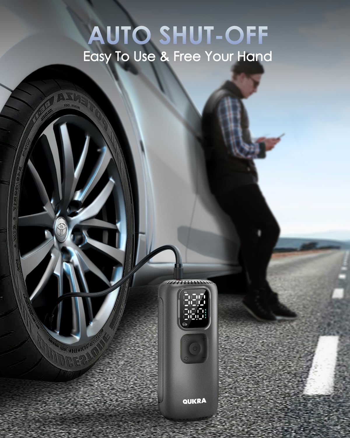 - [Auto Shut-off and Digital Display]: With real-time pressure monitoring, this portable air compressor automatically stops upon reaching your preset target pressure, delivering hands-free operation for effortless inflation. Set your target PSI, the smart air pump will handle the rest. During inflation, expect some heat buildup in the hose and metal connections, it's normal. Handle carefully to avoid burns when attaching or removing