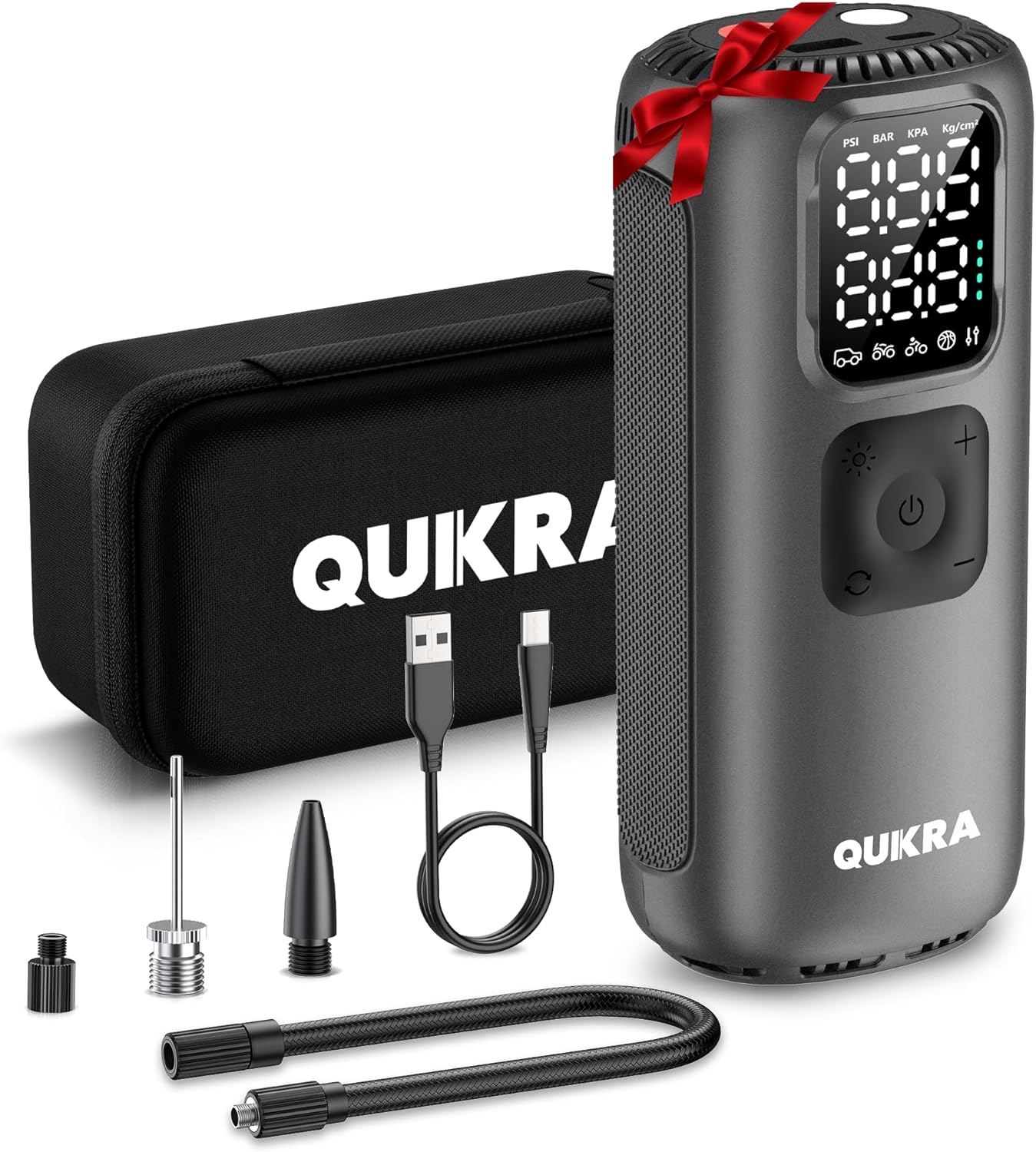 - [Package Include]: Smart portable tire inflator T22 (gray)*1, storage bag*1, schrader valve air hose*1, presta valve*1, ball needle*1, type-C charging cable*1, swimming ring valve*1, service manual*1. If you have any questions, we are here to help you, QUIKRA devoted to provide premium product and customer-satisfying service