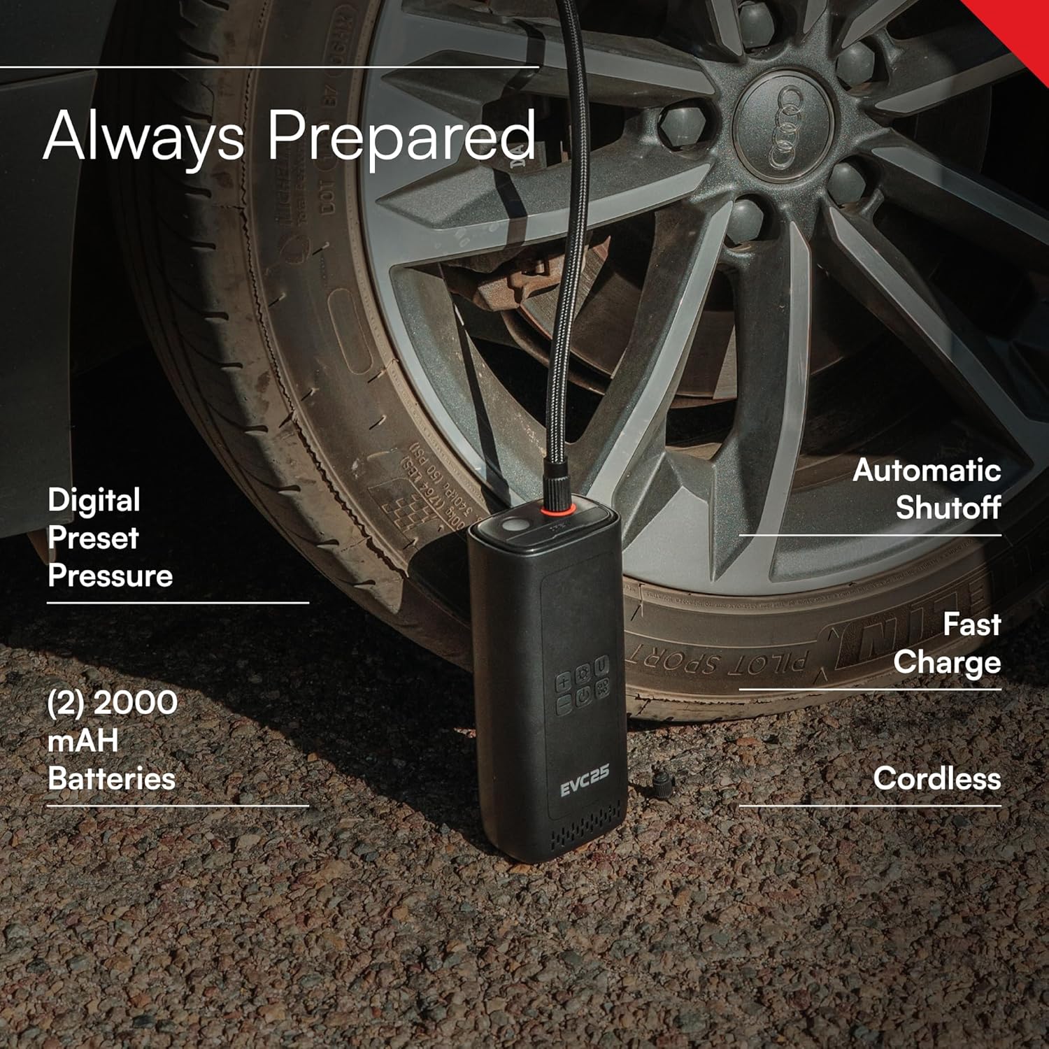 - MULTI-USE AND ACCURATE - The EVC25 is a portable rechargeable air compressor for your car, motorcycle or inflatables. It includes multiple nozzle options to fit various valve types, making it essential for emergency car kits, outdoor activities