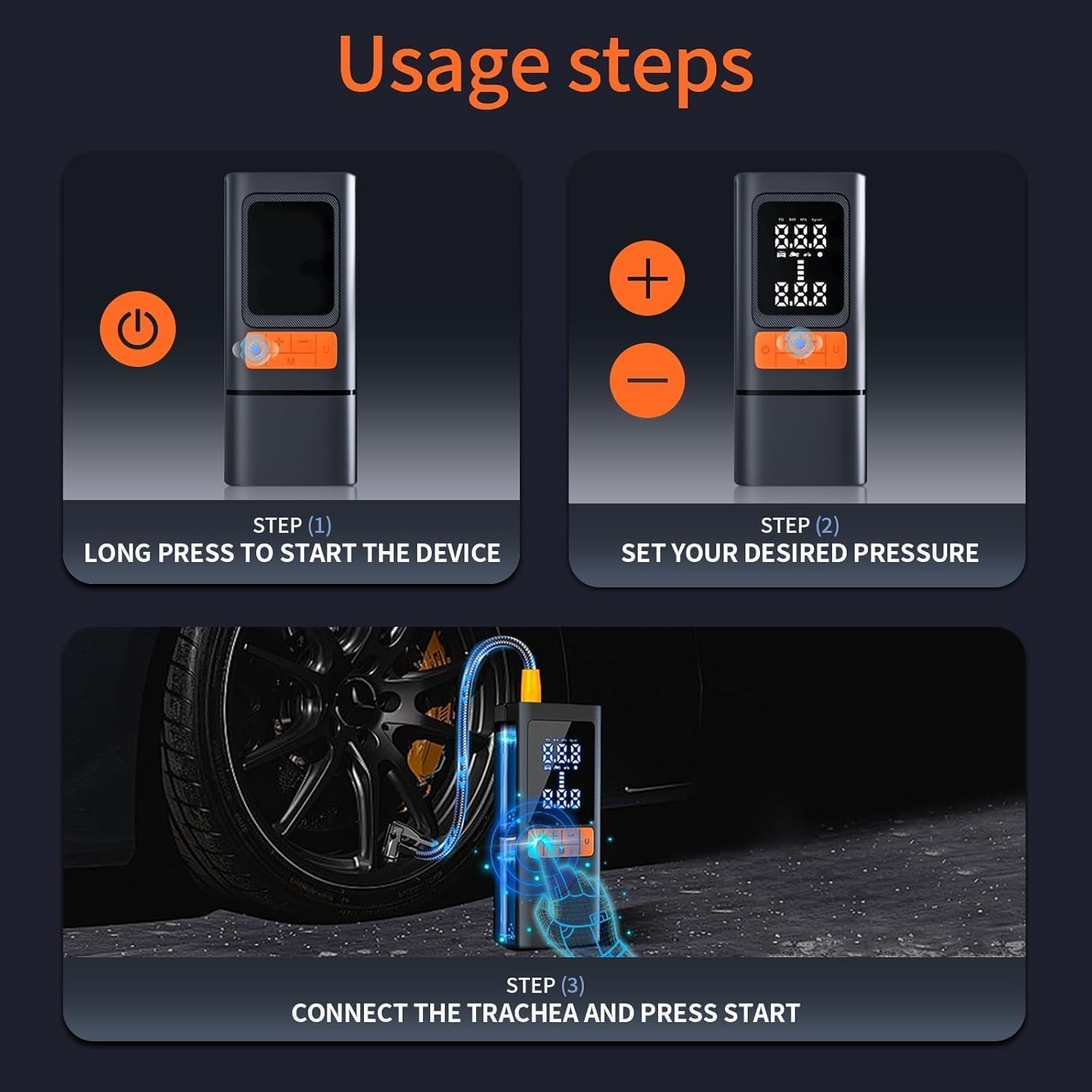 - Features preset inflation modes (Car/Motorcycle/Bike/Ball) and supports 4 pressure units (PSI, BAR, KPA, Kg/cm²). With one-click operation and auto shut-off, this cordless tire inflator ensures precise and safe inflation.