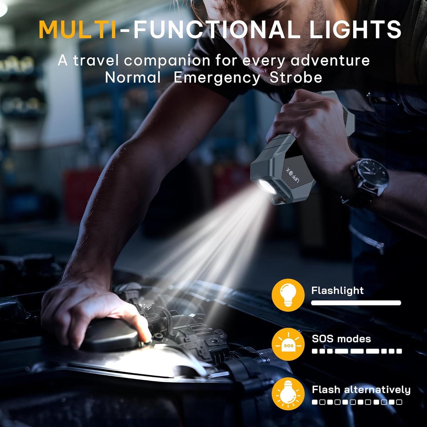 - 【MULTI-FUNCTIONAL EMERGENCY AIR PUMP】:Beyond tire inflation, this tool serves as a flashlight and emergency power bank. Its top-mounted LED features three modes (Steady, SOS, Strobe) for nighttime inflation, tire changes, or vehicle alerts. The bottom integrates a Type-C charging port and 5V/2A USB output to charge phones and electronics, providing critical backup power during roadside emergencies. This versatile solution keeps you prepared for sudden breakdowns, ensuring safer journeys for you, family, and friends.