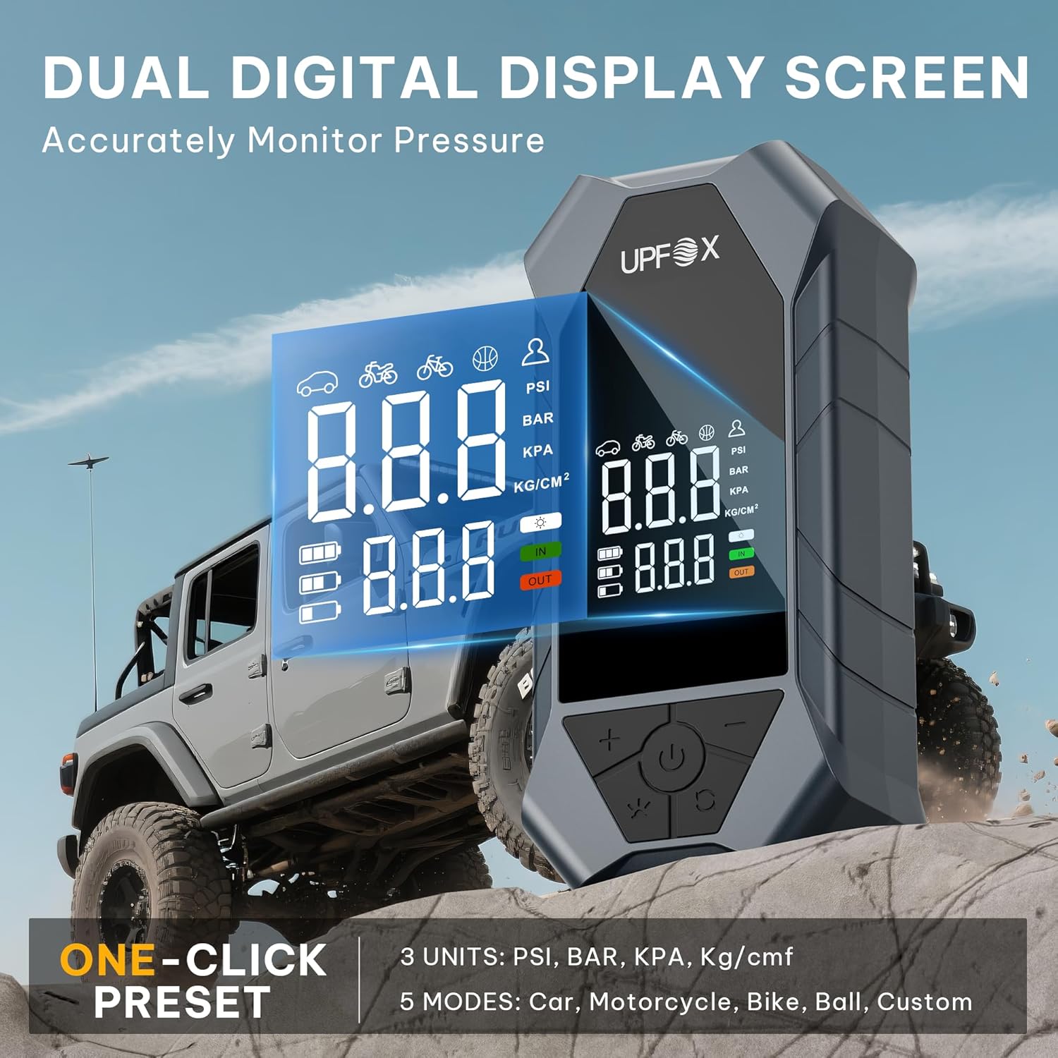 - 【ONE-CLICK 5 MODE OPERATION】 :This tire air compressor offers 5 preset inflation modes (Bicycle, Motorcycle, Car, Ball, and Custom) and supports 4 pressure units (PSI, KPA, BAR, KG/CM²). To operate, simply press and hold the power button to turn on the device and LCD screen, then press the button to easily set the desired pressure value for your specific inflation task. This intuitive design ensures effortless mode switching and convenient operation, making it an essential tool that meets all inflation needs for drivers, cyclists, and adventurers.