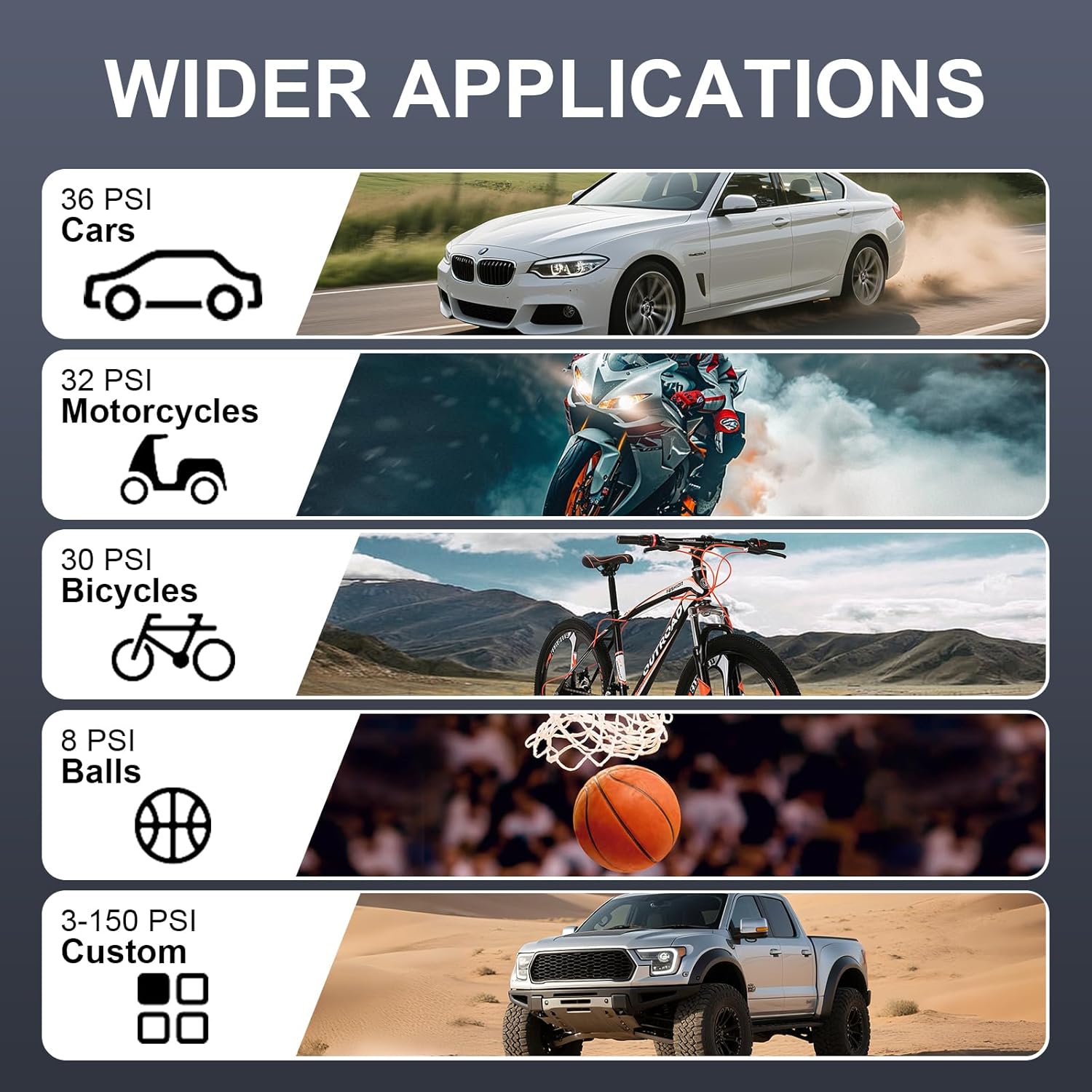 - Powerful Inflation Capacity - With a maximum output pressure of 150 PSI, it can quickly inflate tires of bicycles, motorcycles, cars, and various balls. Note: this air pump is not suitable for large heavy - duty vehicle tires, such as those of trucks, large lorries, and container trucks.